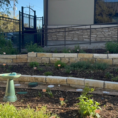 We created a plan to terrace the slope into three levels, divide the levels with limestone blocks, dig up the clay ground, fold in mulch and compost, and plant Texas native plants that would draw critters. Lots of hard work continued throughout the summer of 2025, into the next school year, and into 2026.