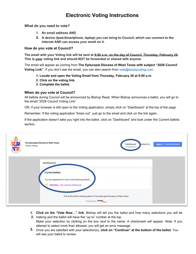 The email will appear as coming from The Episcopal Diocese of West Texas with subject “2026 Council Voting Link”. If you don’t see the email, you can also search from vote@simplyvoting.com.